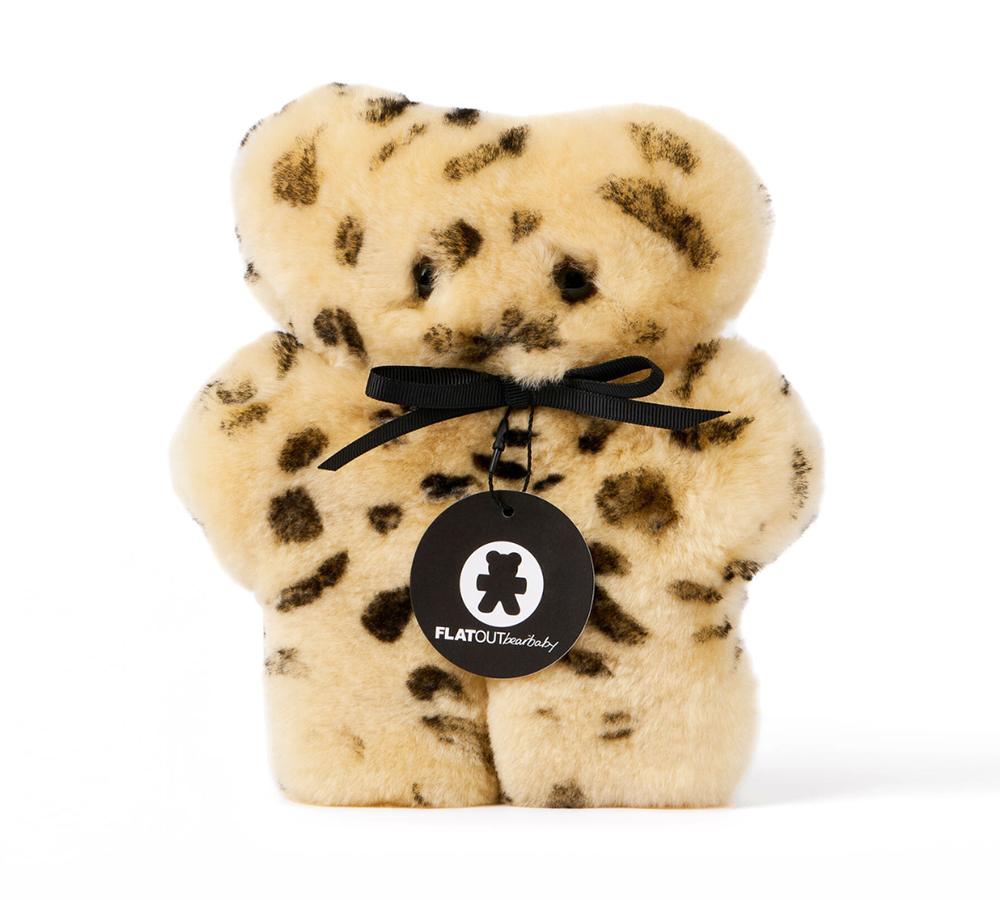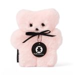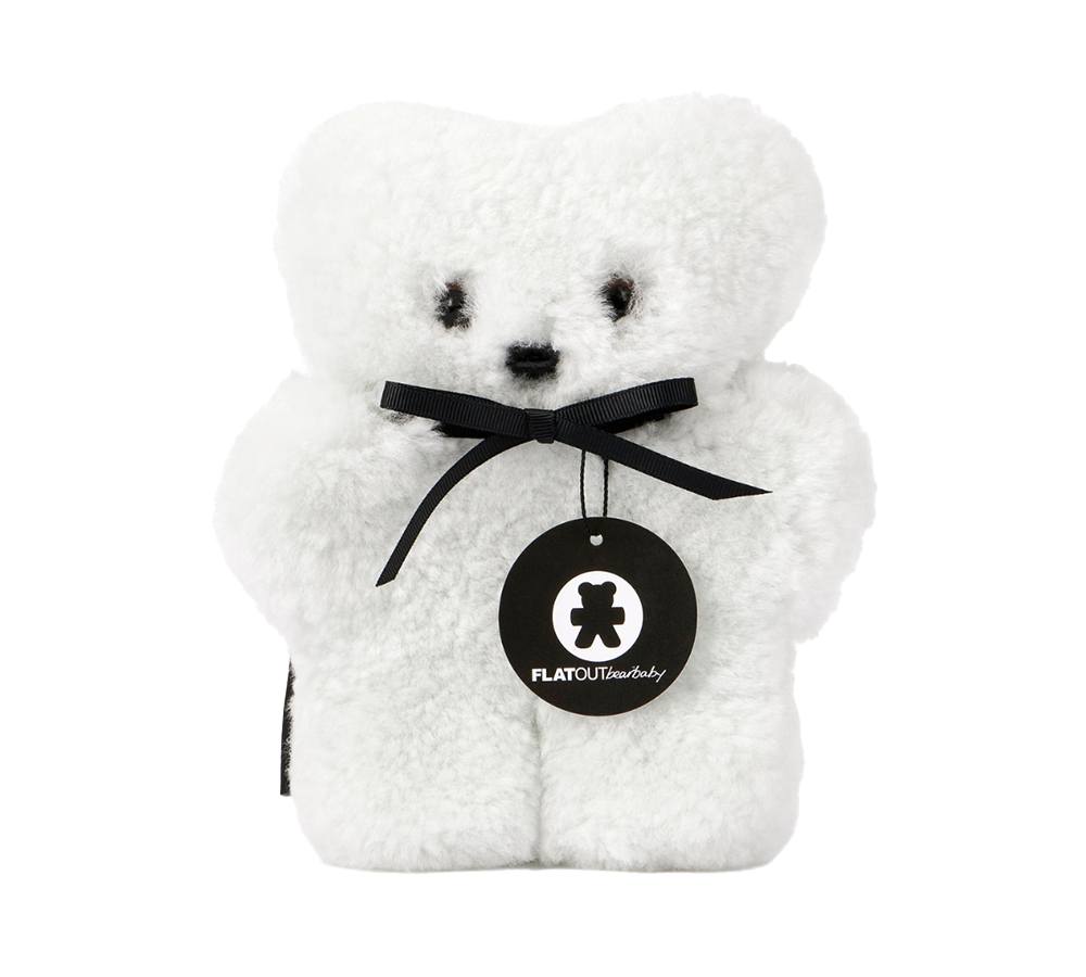 - A soft baby sheepskin bear with a plush, cloud-like texture.